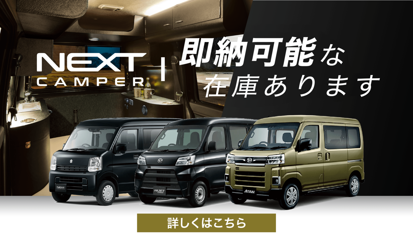 【注釈】■商品の色、模様は実際の色と異なって見えることがあります。■品質向上の為、価格及び、仕様・装備・設定は予告なく変更することがあります。■イメージ写真には撮影用小物、オプションパーツ等を含むことがあります。■全てのベース車はハイルーフに限ります。■NEXT CAMPER(ネクストキャンパー)は株式会社ブレイズの登録商標です。■内容は2025年1月現在のものです。