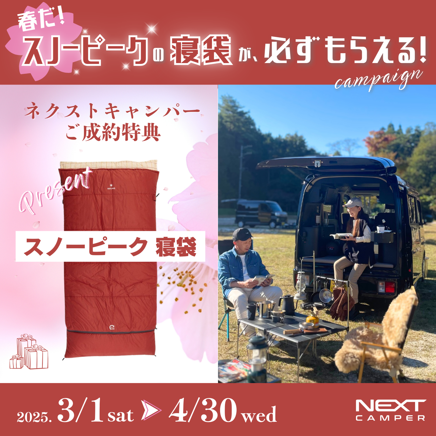 軽キャンピングカーキット NEXT CAMPERが、お得なキャンペーンを実施!2025年3月1日(土)~4月30日(水)の期間、軽キャンピングカーキット「NEXT CAMPER(以下、ネクストキャンパー)」をご成約いただいたお客様に、スノーピークの寝袋をプレゼントするキャンペーンを実施いたします。 ぜひこの機会に、スノーピークの寝袋をゲットし、ネクストキャンパーと一緒にアウトドアライフをお楽しみください。 |